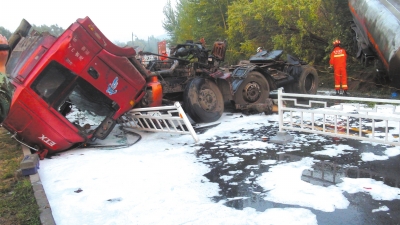前天下午,延慶縣京藏高速西撥子環(huán)島橋旁,一滿載32噸柴油的油罐車失控側翻,柴油泄漏。延慶消防組織救援,將漏油稀釋和用土掩蓋,并將漏油處封堵運走剩油。文/京華時報記者常